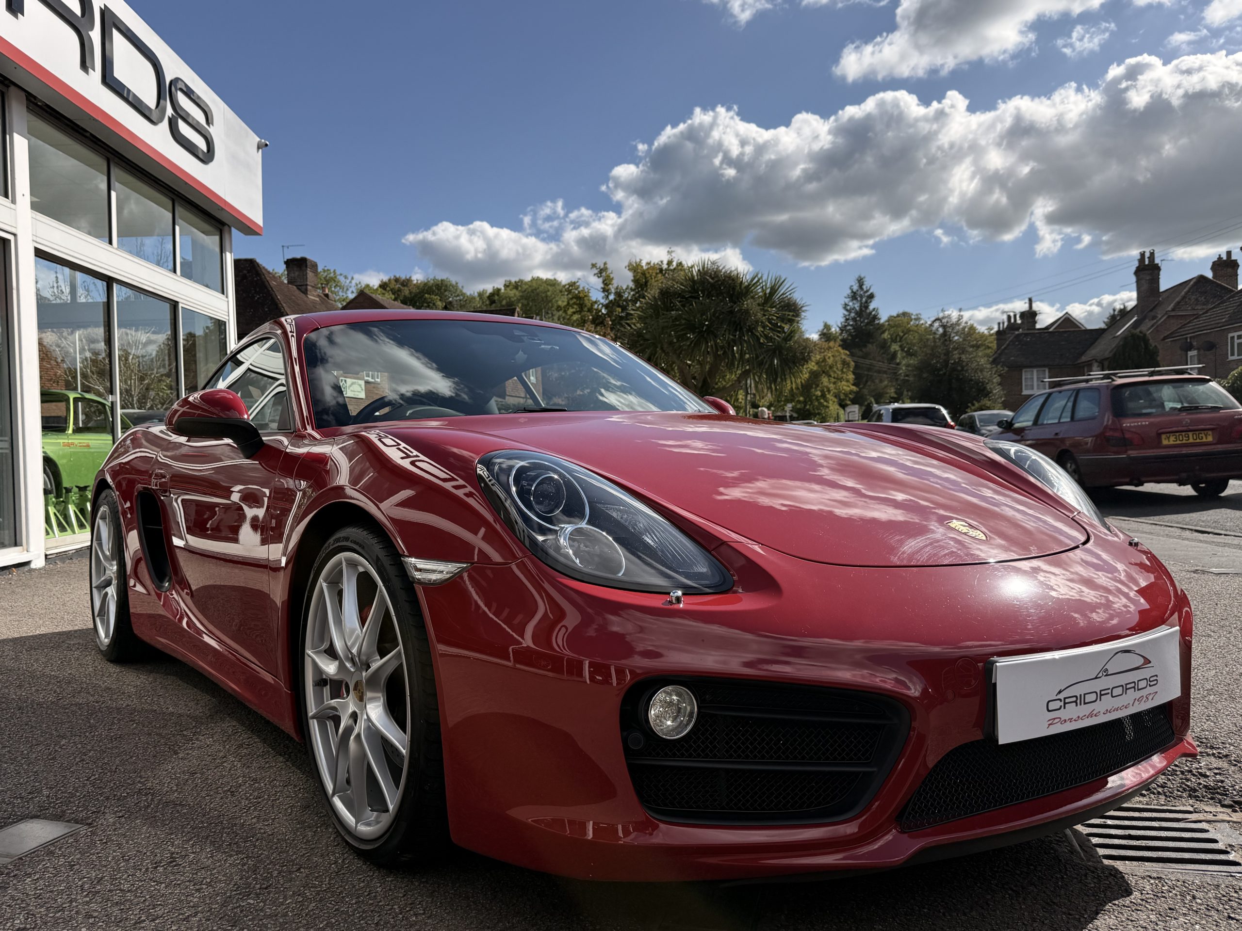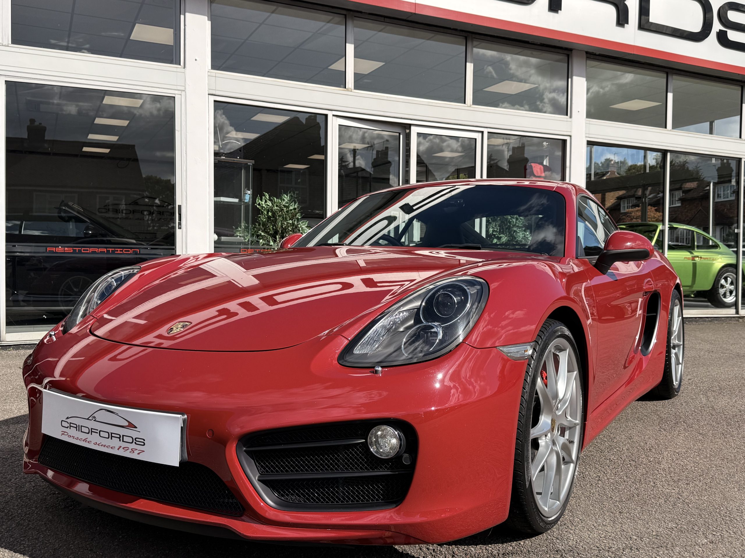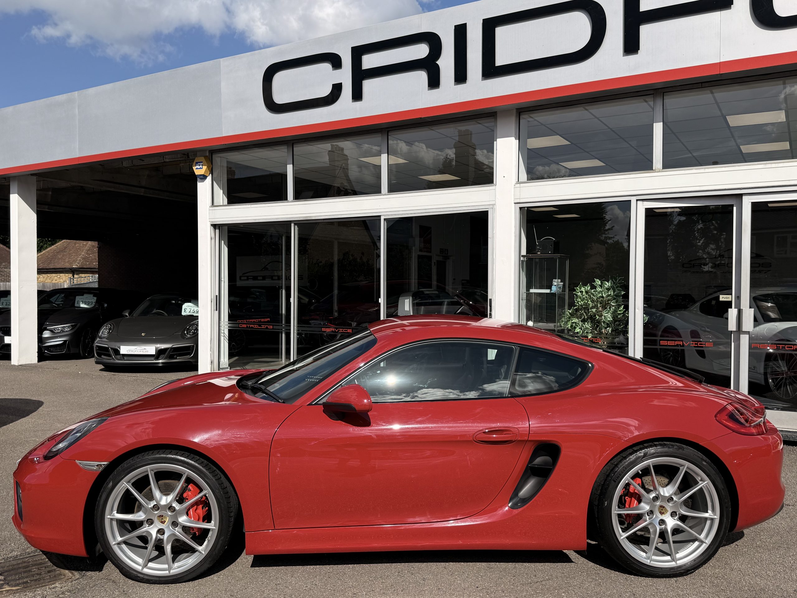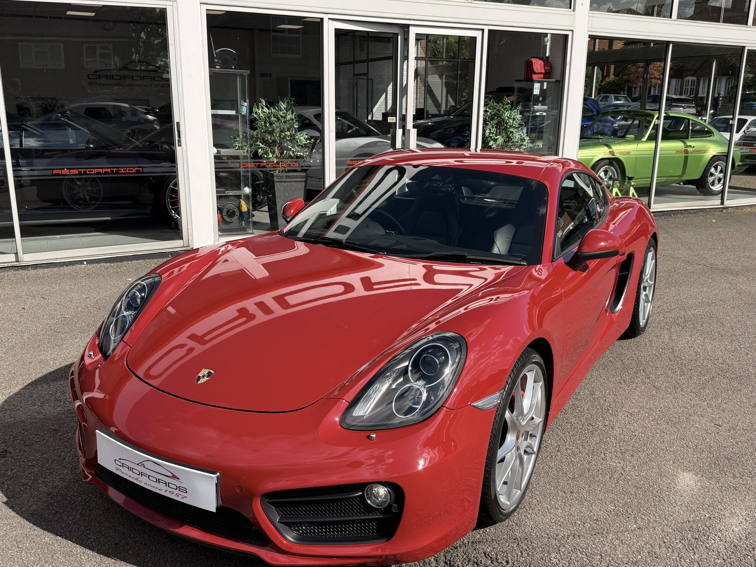 A stunning Cayman S finished in Carmine red trimmed with black leather. Equipped with PCM satellite navigation, 20″ Carrera S alloys, sport Chrono package plus inc. Porsche active dynamic mounts (PADM), Porsche switchable sports exhaust, Porsche active suspension management (PASM), Sport Design steering wheel, electric folding mirrors, rain sensing wipers, self dimming mirrors, front and rear park assist, Bi-Xenon headlamps with Porsche dynamic lighting system plus (PDLS+), hard back sports seats plus, rear wiper, Porsche sound package plus, Bluetooth phone and audio, DAB radio, heated seats, air conditioning and trip computer. Cridfords Ltd Independent Porsche Specialists since 1987, supplied with a full service history and 12 months warranty. Ask us about the Cridfords Care Package (available on cars up to 10 years old at point of sale) including an additional 12 months warranty and Gtechniq ceramic coating for only £1,295. Finance available from 7.9% APR and part exchange welcome.
